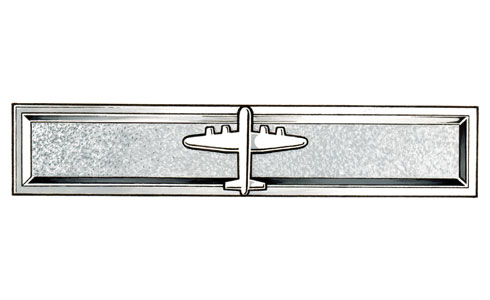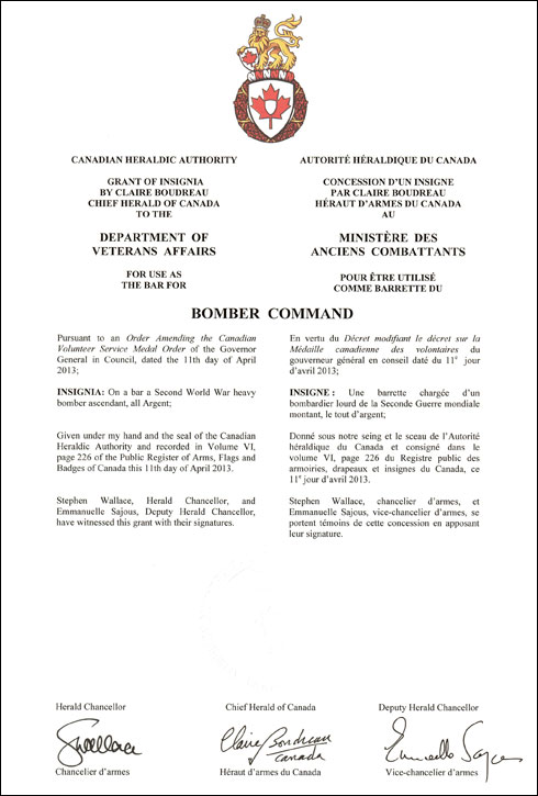 Insignia for use as the bar for Bomber CommandBlazonOn a bar a Second World War heavy bomber ascendant, all Argent; SymbolismThe design of the bar is inspired by that of the overseas service bar to the Canadian Volunteer Service Medal. The aircraft represents the heavy bombers used by Bomber Command during the Second World War, most notably the Avro Lancaster, the Handley Page Halifax, and the Short Stirling. |