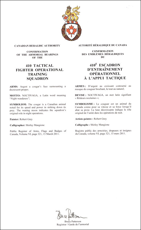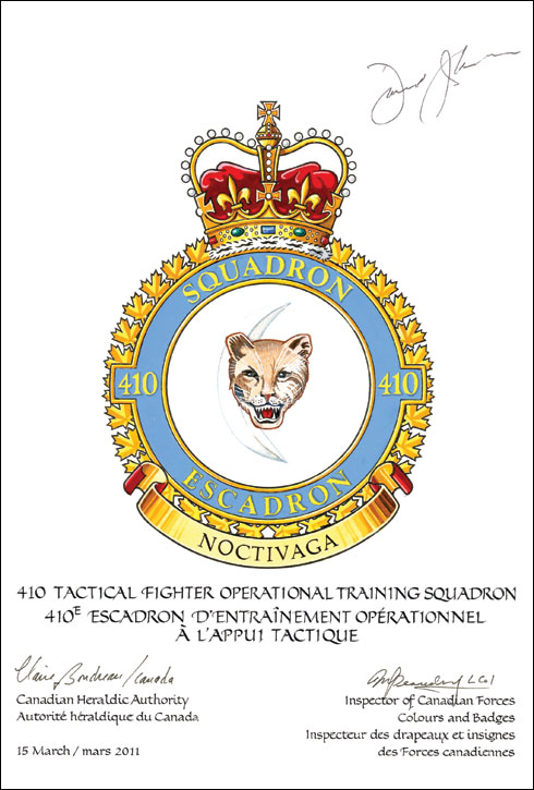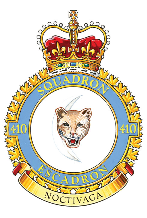 Badge of the 410 Tactical Fighter Operational Training SquadronBlazonArgent a cougar’s face surmounting a decrescent proper; SymbolismThe cougar is a Canadian animal noted for its speed and power in striking down its prey. The waning moon indicates the squadron’s original role in night operations. |