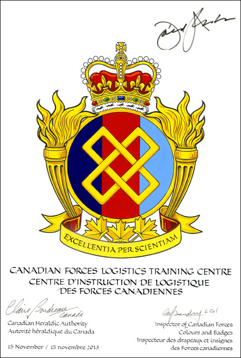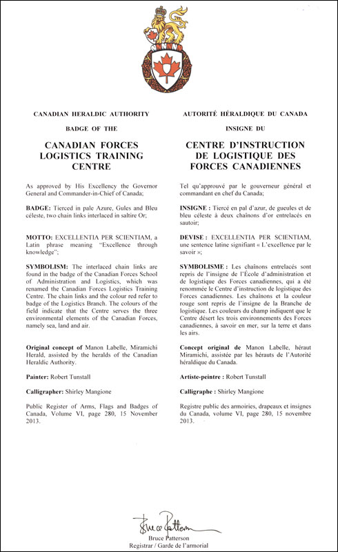 Badge of the Canadian Forces Logistics Training CentreBlazonTierced in pale Azure, Gules and Bleu céleste, two chain links interlaced in saltire Or; SymbolismThe interlaced chain links are found in the badge of the Canadian Forces School of Administration and Logistics, which was renamed the Canadian Forces Logistics Training Centre. The chain links and the colour red refer to the badge of the Logistics Branch. The colours of the field indicate that the Centre serves the three environmental elements of the Canadian Forces, namely sea, land and air. |
