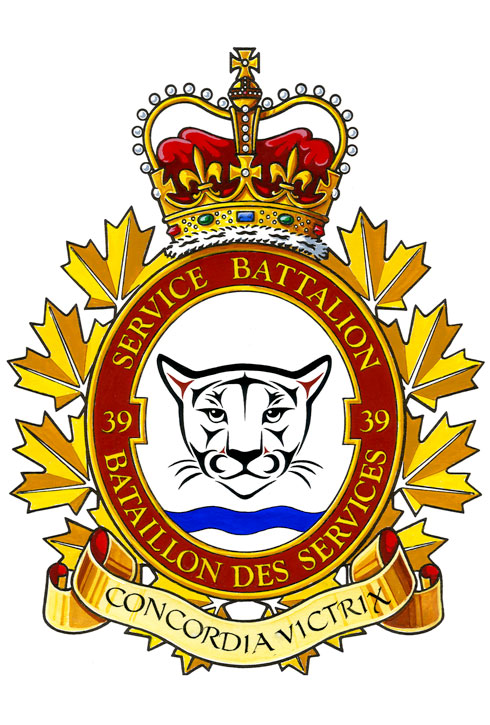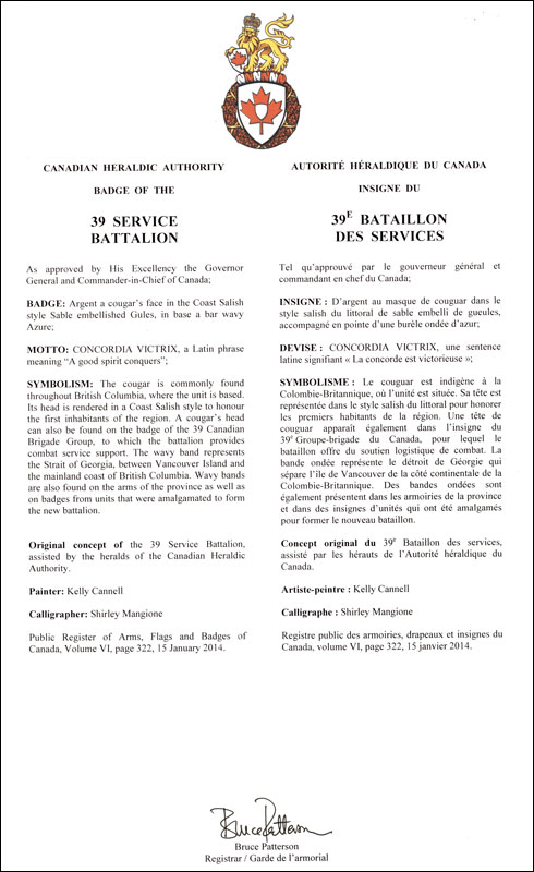 Additional InformationCreator(s)Original concept of the 39 Service Battalion, assited by the heralds of the Canadian Heraldic Authority. PainterKelly Cannell CalligrapherShirley Mangione Recipient TypeMilitary Institution |