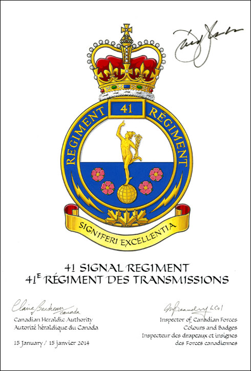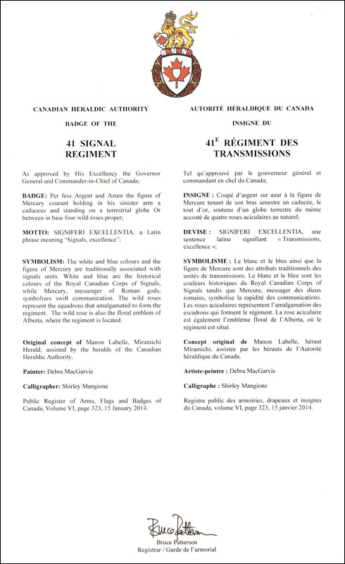 Badge of the 41 Signal RegimentBlazonPer fess Argent and Azure the figure of Mercury courant holding in his sinister arm a caduceus and standing on a terrestrial globe Or between in base four wild roses proper; SymbolismThe white and blue colours and the figure of Mercury are traditionally associated with signals units. White and blue are the historical colours of the Royal Canadian Corps of Signals, while Mercury, messenger of Roman gods, symbolizes swift communication. The wild roses represent the squadrons that amalgamated to form the regiment. The wild rose is also the floral emblem of Alberta, where the regiment is located. |