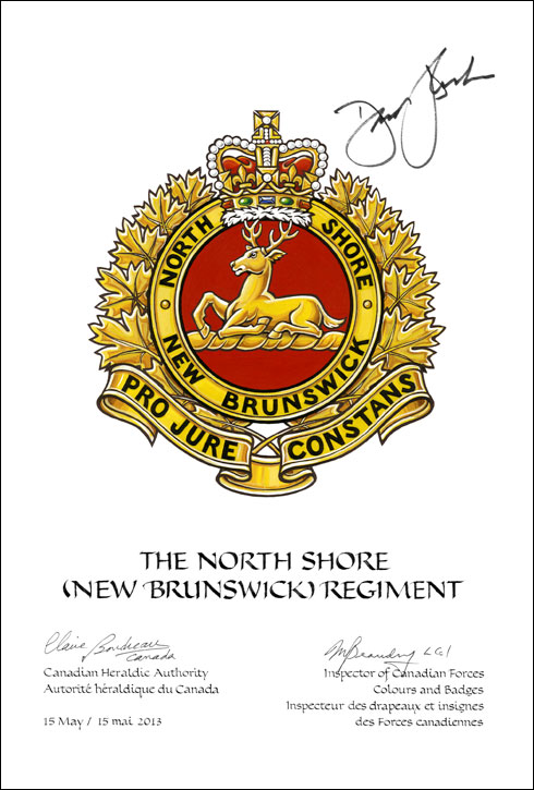 Additional InformationCreator(s)Original concept of The North Shore (New Brunswick) Regiment, assisted by the heralds of the Canadian Heraldic Authority. PainterEva Pilar-Cass CalligrapherShirley Mangione Recipient TypeMilitary Institution |