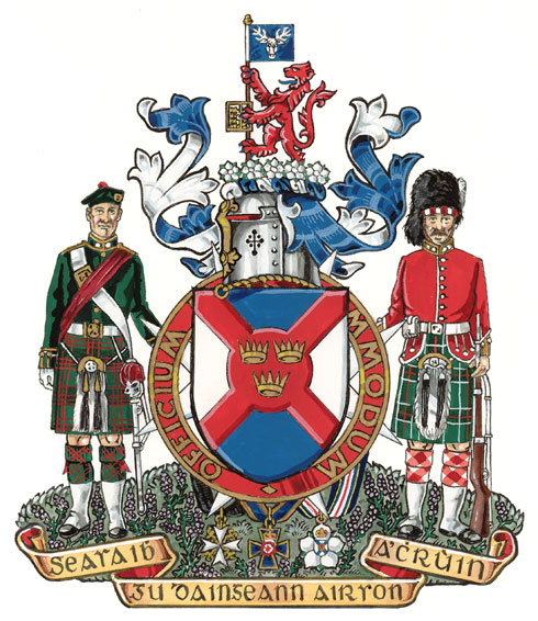 SupportersBlazonDexter an officer of the Nova Scotia Highlanders tempore 1954, sinister a non-commissioned officer of the Pictou Highlanders tempore 1910, both standing on a mount of heather proper; SymbolismThese members of the Nova Scotia Highlanders and the Pictou Highlanders pay tribute to the units in which His Honour served. |