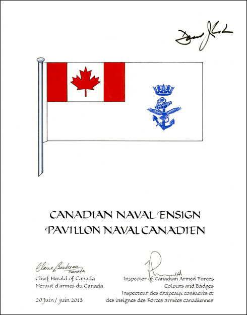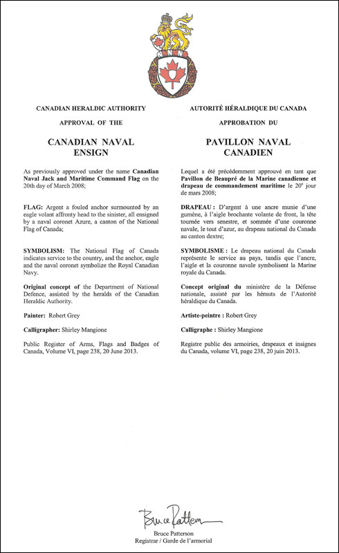 Additional InformationCreator(s)Original concept of the Department of National Defence (1968). PainterRobert Grey CalligrapherShirley Mangione Recipient TypeMilitary Institution Other InformationThe recipient's emblems were originally recorded in the name of Canadian Naval Jack and Maritime Command Flag in the Public Register of Arms, Flags and Badges of Canada, Volume 5, page 242, 20 March 2008. |