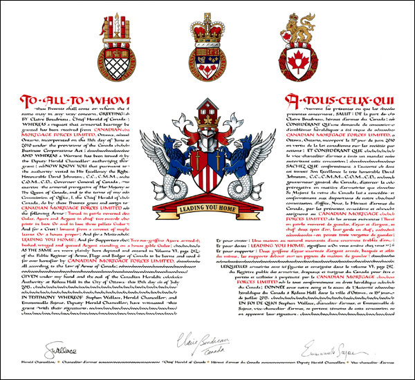 SupportersBlazonTwo sea-griffins Azure armed, beaked, winged and queued Argent standing on a house gable Gules; SymbolismThe griffin is a traditional guardian of treasure, here denoting Canadian Mortgage Forces’ actions to secure the best possible mortgage terms for its clients. This particular “sea-griffin”, with characteristics of an eagle, a lion and a fish, represents the three elements of the Canadian Forces served by the company. |