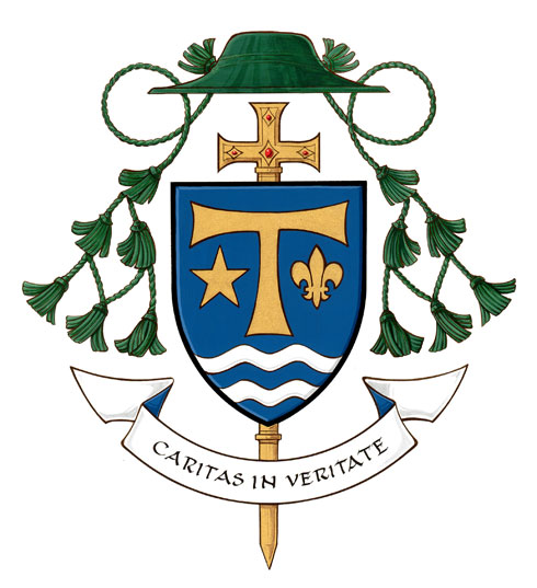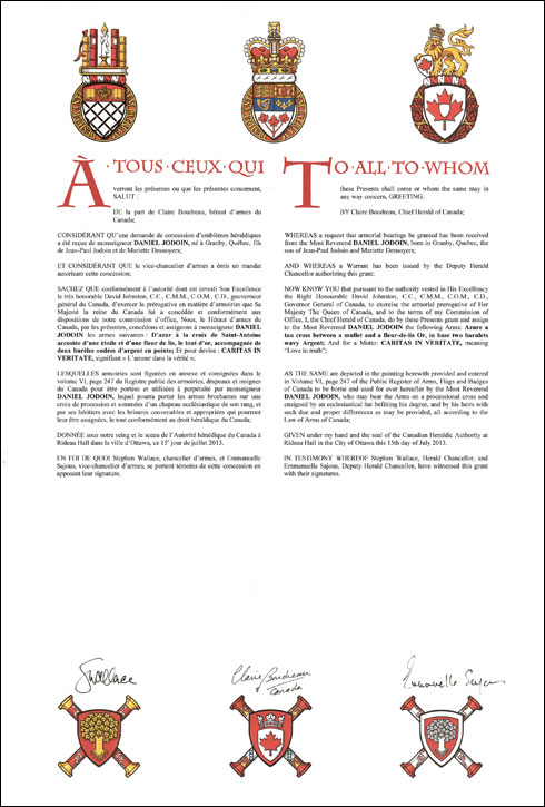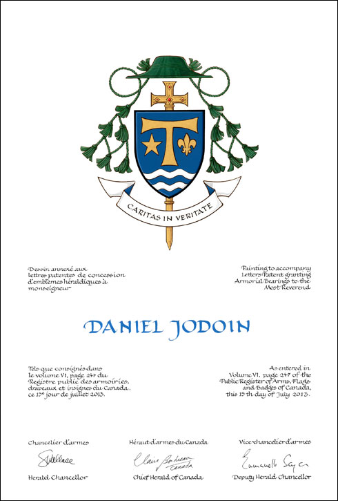MottoBlazonCARITAS IN VERITATE; SymbolismThis Latin phrase, meaning "Love in truth," consists of the opening words of the last encyclical letter of Pope Benedict XVI, who appointed Bishop Jodoin to the episcopacy. |