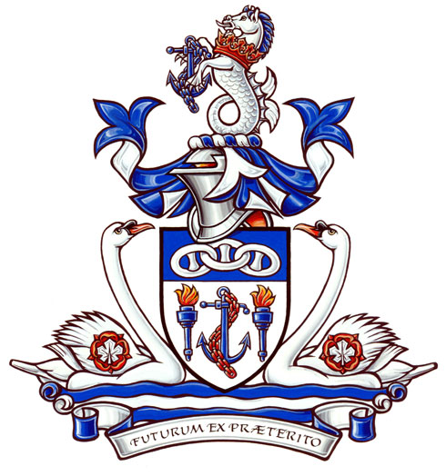 SupportersBlazonTwo swans naiant Argent on barry wavy Azure and Argent, each charged on the wing with a rose Gules bearing a maple leaf Argent; SymbolismThe swan is a water-dwelling bird, and thus refers to the Archive’s interests in both nautical and aeronautical matters. The rose and maple leaf refer to the focus of the Archive’s work on England and Canada. |