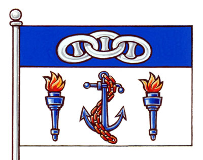Arms of the Naval Marine Archive The Canadian CollectionBlazonArgent an anchor Azure fouled of a chain Gules between two torches Azure enflamed proper, on a chief Azure a chain of three links Argent; SymbolismThe anchor refers to the society’s mandate for preserving naval records, and the torches symbolize learning. The chain links refer to the silver Covenant Chain, a representation of which appears in the Archive’s exhibition space. The chain is a symbol of alliance between Europeans and Iroquois, and its three links symbolize peace, friendship and respect. It thus represents the Archive’s work related to the heritage of local First Nations. The blue, white and red colours are those of the Royal Union Flag and refer to the Loyalist heritage of the Picton region as well as to the extensive records held by the Archive related to the naval heritage of Great Britain. |