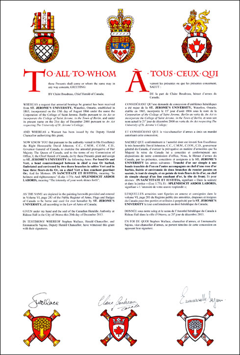 Additional InformationCreator(s)Original concept of Darrel Kennedy, Assiniboine Herald, and Bruce Patterson, Deputy Chief Herald of Canada, assisted by the heralds of the Canadian Heraldic Authority. PainterLinda Nicholson CalligrapherShirley Mangione Recipient TypeCivil Institution