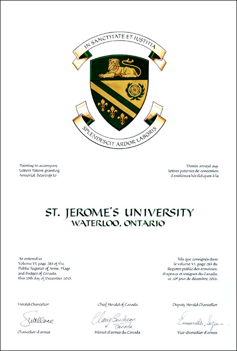 Arms of St. Jerome's UniversityBlazonPer bend Or and Vert, a bend counterchanged between in chief a rose Or barbed, fimbriated and environed by two thorn branches in saltire Vert and in base three fleurs-de-lis Or, on a chief Vert a lion couchant guardant Or; SymbolismGreen and gold are the traditional colours of the university. The lion is a well-known attribute of Saint Jerome. Representing a chalice, the rose is enclosed in branches adorned with seven thorns recalling the seven gifts of the Holy Spirit. The three fleurs-de-lis evoke the Blessed Trinity, and also the Virgin Mary, whose emblem is the lily. The rose and fleur-de-lis represent respectively the English and French origins of Canada. These colours and symbols have been used by the university for several years. |