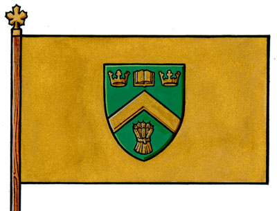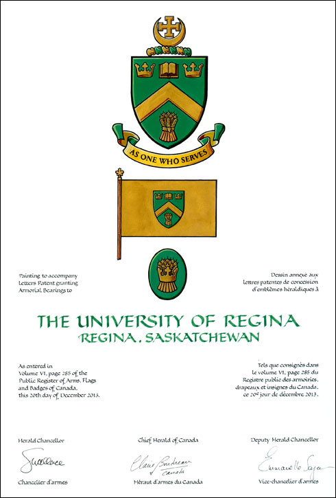 Arms of The University of ReginaBlazonVert a chevron between in chief an open book flanked by two ancient crowns and in base a garb Or; SymbolismThe arms in their original form date from 1912, and were created for Regina College by Vincent Massey, who later became Governor General of Canada, and the Rev. Wilbur Williams Andrews, the first principal of the college. The coronets make a reference to Regina, the “Queen City”, and the garb of wheat is taken from the arms of Saskatchewan. The book indicates that the university is a centre of learning. The gold and green colours, which were probably added to the original design in the 1920s, were those of Regina College, and are also the main colours of the provincial coat of arms. |