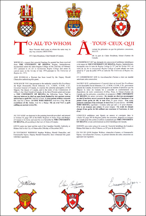 Additional InformationCreator(s)Original concept of Vincent Massey and Wilbur Williams Andrews (original Arms, Crest and Motto) and Bruce Patterson, Deputy Chief Herald of Canada (revised Arms, Flag and Badge), assisted by the heralds of the Canadian Heraldic Authority. PainterDavid Farrar CalligrapherShirley Mangione Recipient TypeCivil Institution