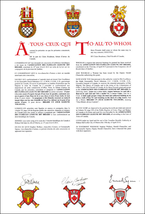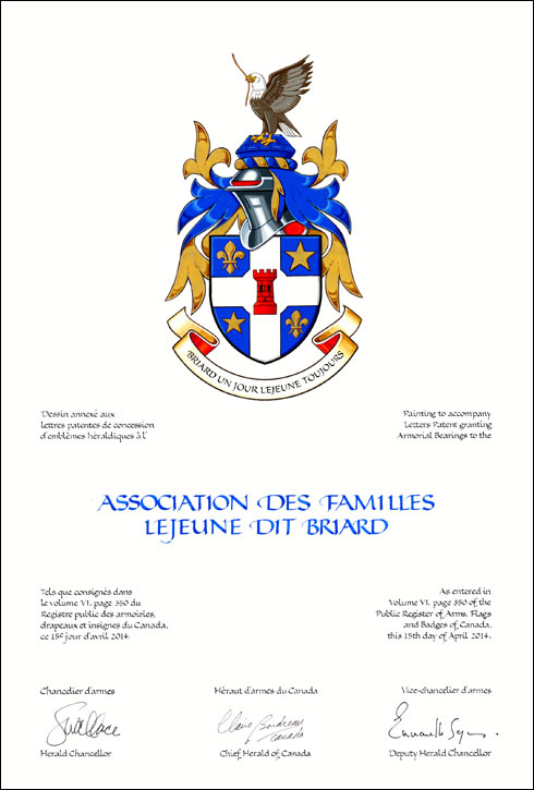 Arms of the Association des familles Lejeune dit BriardBlazonAzure on a cross nowy Argent between 1st and 4th a fleur-de-lis and 2nd and 3rd a mullet Or, a tower Gules; SymbolismThe blue, white, red and yellow honour the Acadian flag and the ancestor Pierre Lejeune dit Briard, who arrived in Acadia in 1651. The lilies represent France, his mother country, and the stars represent Acadia, his adopted homeland. The cross underscores the Acadian ancestors’ faith in God and in their return to Acadia from Quebec and Louisiana. The tower recalls the castles of the coats of arms of the ancient province of Brie, in France, the birthplace of Pierre Lejeune dit Briard, notably those of the communes of Provins, Brie-Comte-Robert and Château-Thierry. |