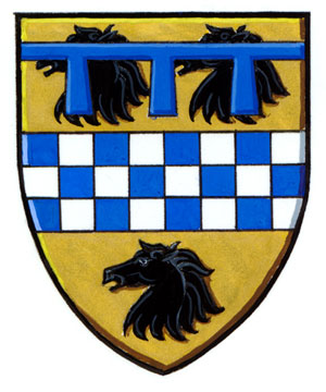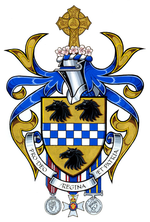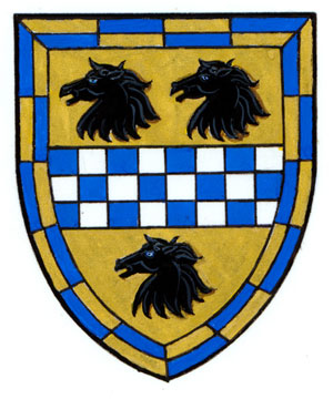 Arms of William John Edwards StewartBlazonOr a fess chequy Azure and Argent between three horses’ heads erased Sable; SymbolismThe gold shield with the blue and white chequerboard central stripe is a traditional feature of Scottish Stewart Arms. The three horses’ heads represent the horses St. James, George, and Elizabeth that Mr. Stewart, in his capacity as Riding Master for the Royal Canadian Mounted Police (RCMP), trained for presentation to Her Majesty Queen Elizabeth II. |