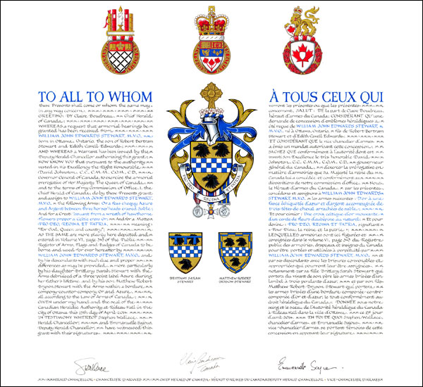 Grant of Arms, with differences to Brittany Sarah Stewart and Matthew Robert Bryson Stewart