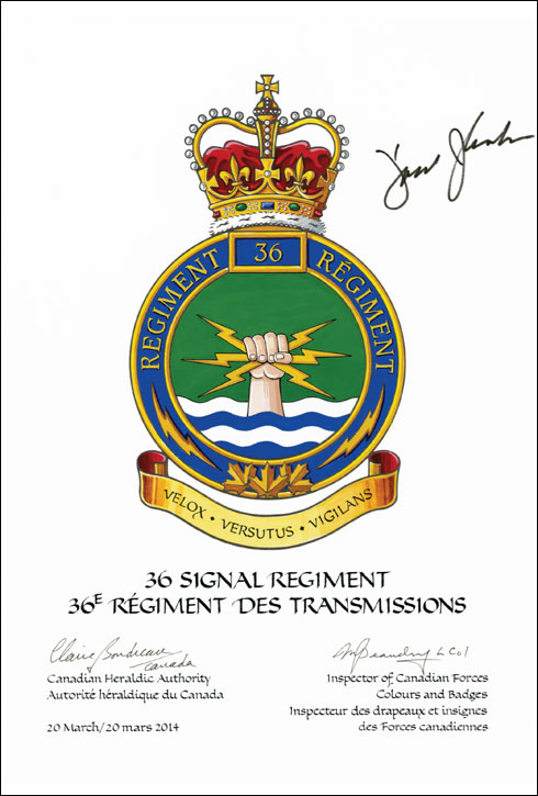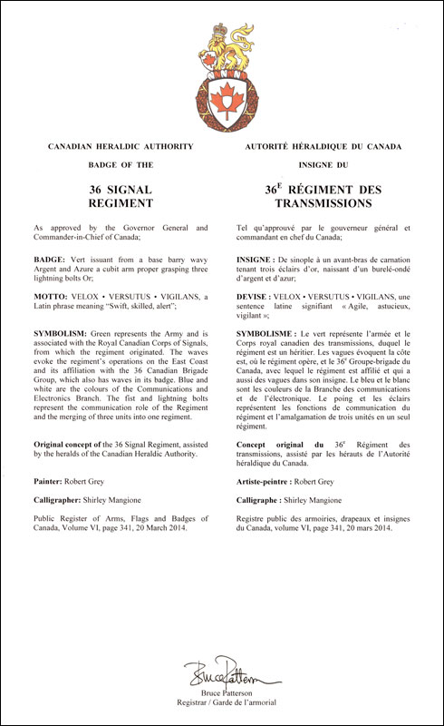 Additional InformationCreator(s)Original concept of the 36 Signal Regiment, assisted by the heralds of the Canadian Heraldic Authority. PainterRobert Grey CalligrapherShirley Mangione Recipient TypeMilitary Institution |