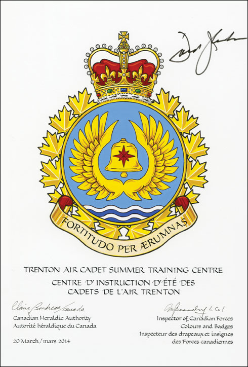 Badge of the Trenton Air Cadet Summer Training CentreBlazonBleu céleste a vol environing a bell Or charged with a compass rose Gules, a base barry wavy Argent and Azure; SymbolismLight blue is the colour of the Royal Canadian Air Cadets. The bell was sounded for emergencies, reveille, muster parades and hourly at the Trenton Air Cadet Summer Training Centre. The compass rose is a feature of the badges of both 8 Wing and Canadian Force Base Trenton, of which the training centre is a lodger unit. It further represents the direction that cadet training provides to the cadets as they navigate their way through the transition to adulthood. The wings refer to the eagle that is found on the Air Cadet badge. The waves are taken from the coat of arms of the City of Quinte West and the badge of 8 Wing. |