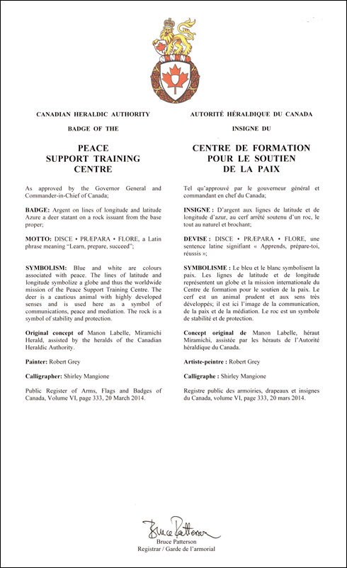 Additional InformationCreator(s)Original concept of Manon Labelle, Miramichi Herald, assisted by the heralds of the Canadian Heraldic Authority. PainterRobert Grey CalligrapherShirley Mangione Recipient TypeMilitary Institution |