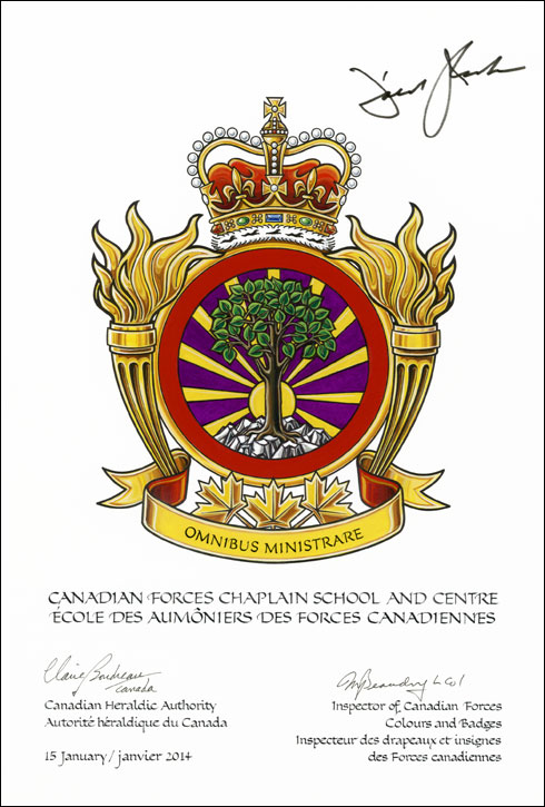 Badge of the Canadian Forces Chaplain School and CentreBlazonPurpure a sun in splendour throughout debased Or overall a tree issuant from a rock proper; SymbolismPurple and gold are colours associated with the clergy. The tree, the sun and the rock are taken from the stained glass window named “Hope in a Broken World”, located in the Hall of Colours at Beechwood National Memorial Centre in Ottawa. The tree is an ancient symbol that is common in many faith traditions and depicts the ministry of chaplains throughout history. Known as the “Tree of Life”, it is surrounded by rays representative of the light of the Divine. The roots and the rock symbolize activities strongly rooted in faith. The red border differences this badge from that of the Chaplain Branch, with which the school is affiliated. |