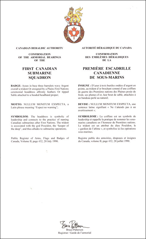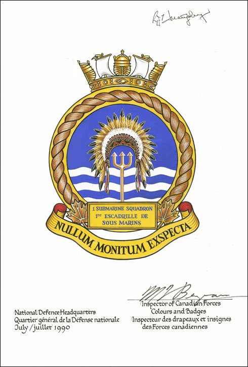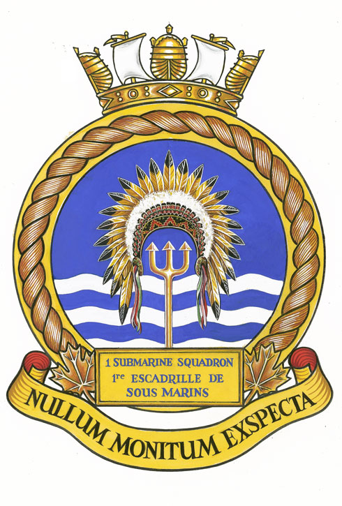 Badge of the First Canadian Submarine SquadronBlazonAzure in base three barrulets wavy Argent overall a trident Or ensigned by a Plains First Nations ceremonial headdress affronty feathers Or tipped Sable attached to a beaded headband proper; SymbolismThe headdress is symbolic of leadership and connects to the practice of naming Canadian submarines after First Nations. The trident is associated with the god Poseidon, the “keeper of the deep”, and thus alludes to submarine operations. |