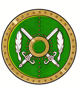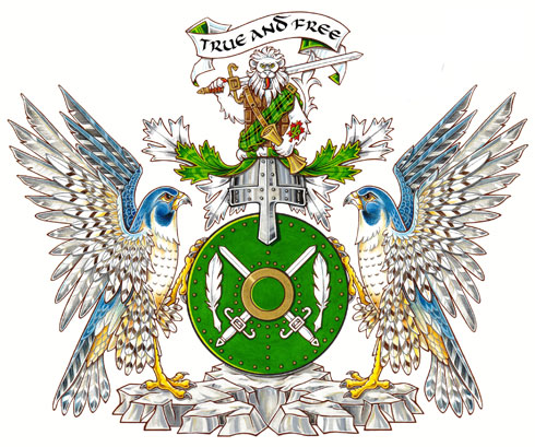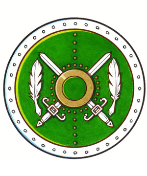 Arms of Stephen Gregory WallaceBlazonVert two claymores in saltire Argent surmounted by a bezant all between two quills Argent, debruised by a pomme during his father’s lifetime; SymbolismThe crossed claymores refer to the family’s readiness to fight for the values of truth and freedom. The feathers, symbolic of travel over great distances, evoke the frequent travels of Mr. Wallace and of his father and other family members. As quill pens, the feathers also refer to the power of the written word and the search for knowledge. The green colour is inspired by the Irish heritage of Mr. Wallace’s mother, Caroline French, and of his ancestor Thomas Wallace, who set sail from Ireland to fight for the Crown in the War of 1812. The green disc is a temporary mark indicating that Mr. Wallace is the heir to his father’s arms. |