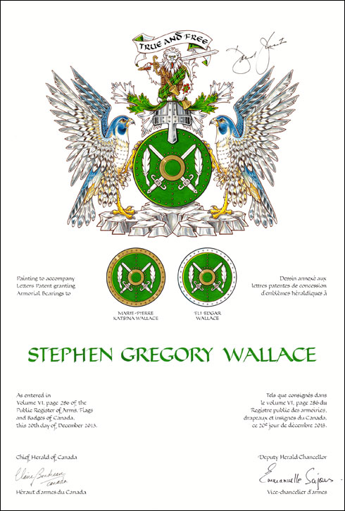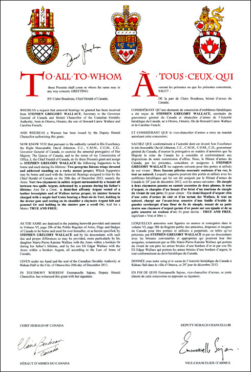Additional InformationCreator(s)Original concept of Claire Boudreau, Chief Herald of Canada, assisted by the heralds of the Canadian Heraldic Authority. PainterCathy Bursey-Sabourin CalligrapherShirley Mangione Recipient TypeIndividual Other InformationThe recipient's emblems (Arms, Crest and Motto) were originally recorded in the name of his father, Howard Carew Wallace, in Public Register of Arms, Flags and Badges of Canada, Volume VI, page 200, 20 December 2012. |