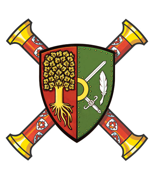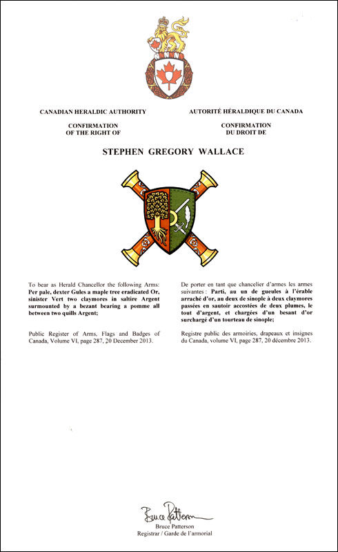Arms of Stephen Gregory Wallace as Herald ChancellorBlazonPer pale, dexter Gules a maple tree eradicated Or, sinister Vert two claymores in saltire Argent surmounted by a bezant bearing a pomme all between two quills Argent; SymbolismThe impaled shield shows the arms of office of the Herald Chancellor on the left marshalled with the personal arms of Stephen Wallace, granted 20 December 2012, on the right. The shield is placed on two representations of the Baton of Office of the Herald Chancellor in saltire. |