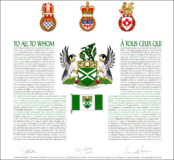 SupportersBlazonTwo peregrine falcons proper each gorged with a collar Or inscribed with zeros and ones Sable and standing on a base of river grass Vert; SymbolismThe falcon is the mascot of the college’s intercollegiate sports teams. The binary code on their collars (meaning “L” and “C” for Langara College) honours the college’s commitment to innovation in instructional information technology. The base of river grass represents the location of the college’s campus in the traditional territory of the Musqueam Nation, “Musqueam” meaning “where the river grass grows”. |
