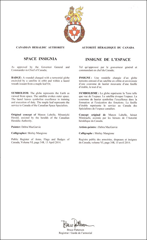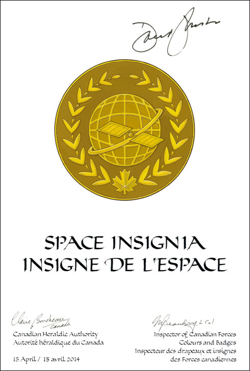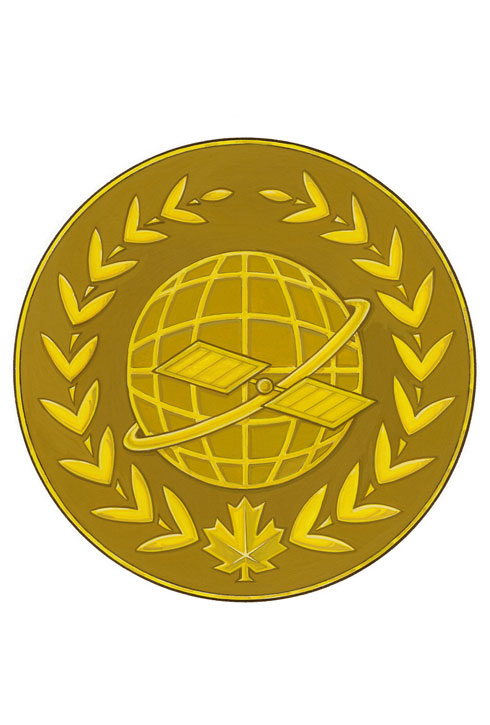 Space InsigniaBlazonA roundel charged with a terrestrial globe encircled by a satellite in orbit and within a laurel wreath issuant from a maple leaf Or; SymbolismThe globe represents the Earth as viewed from space. The satellite evokes outer space. The laurel leaves symbolize excellence in training and execution of duty. The maple leaf represents the service to Canada of the Canadian Space Specialists. |