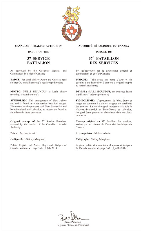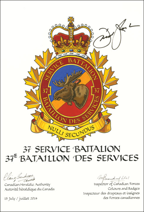 Additional InformationCreator(s)Original concept of the 37 Service Battalion, assisted by the heralds of the Canadian Heraldic Authority. PainterMelissa Aberin CalligrapherShirley Mangione Recipient TypeMilitary Institution |