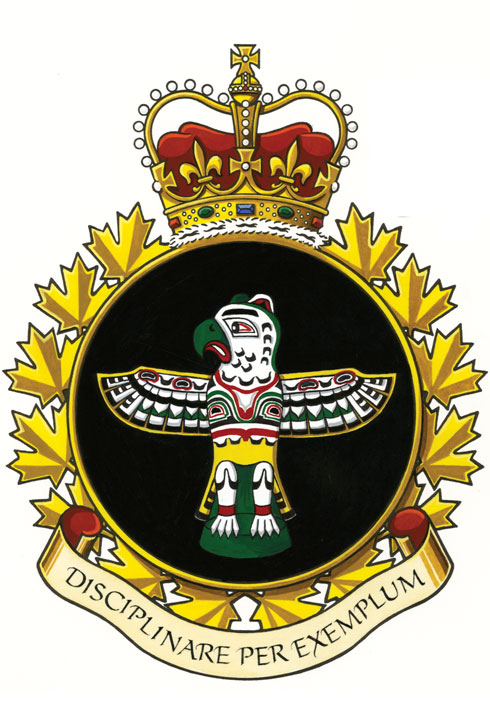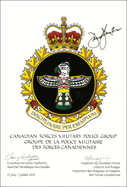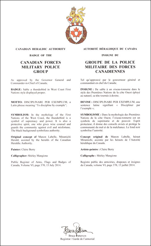 Badge of the Canadian Forces Military Police GroupBlazonSable a thunderbird in West Coast First Nations style displayed proper; SymbolismIn the mythology of the First Nations of the West Coast, the thunderbird is a symbol of supremacy and power. It is also a protective spirit, one who gives wise counsel and guards the community against evil and misfortune. The black background symbolizes authority. |