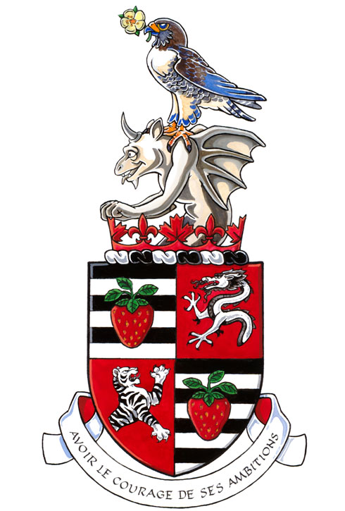Arms of Jonathan MorissetteBlazonQuarterly 1st and 4th barry Sable and Argent a strawberry proper, 2nd Gules a demi-dragon Argent embellished Sable, 3rd Gules a demi-tiger contourné Argent striped Sable; SymbolismThe dragon and the tiger are emblematic of the martial arts and recall Mr. Morissette’s karate training, his role as an instructor, and the karate schools of which he is the sensei. The white and black, and the position of the animals, symbolize yin and yang, an oriental philosophy of great complementarity in martial arts. The pattern of horizontals stripes alludes to the image of a computer monitor and thus evokes his interest in new technologies. The strawberry indicates that Mr. Morissette is descended from farming stock and that his family owns a strawberry farm. The fruit also symbolizes the annual berry-picking by Mr. Morissette and his family, a part of which crop is made into wine. |