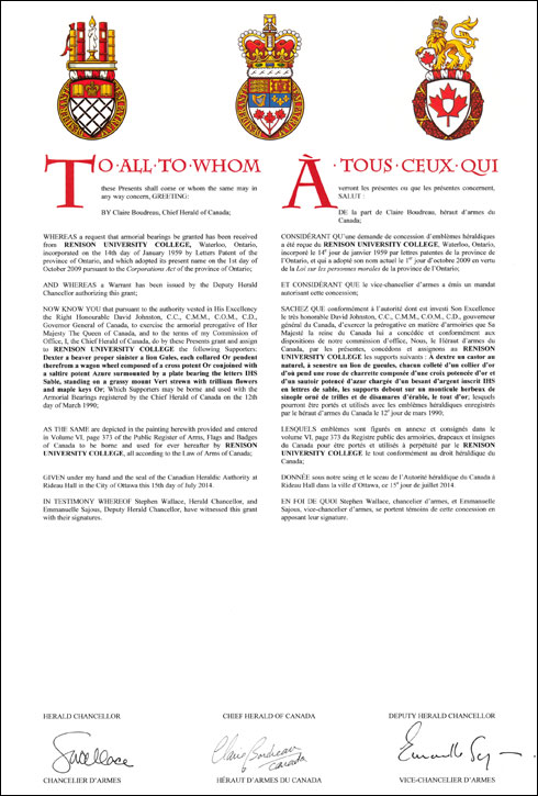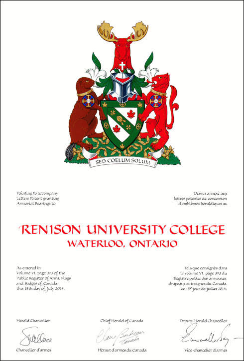 SupportersBlazonDexter a beaver proper sinister a lion Gules, each collared Or pendent therefrom a wagon wheel composed of a cross potent Or conjoined with a saltire potent Azure surmounted by a plate bearing the letters IHS Sable, standing on a grassy mount Vert strewn with trillium flowers and maple keys Or; SymbolismThe red lion is taken from the arms of the University of Waterloo, and thus symbolizes Renison’s affiliation with the university. The red lion is also found in the arms of Bishop D. Ralph Spence, Chancellor of the College at the time of the grant. The beaver is taken from the arms of the Anglican Diocese of Huron, the Bishop of which is the Visitor to the College. The wagon wheel is taken from the arms of the Church of the Holy Saviour, Waterloo, the founding parish of the college. The grassy green mount represents Renison’s verdant campus. The trilliums recall the college’s location in Ontario and the Regional Municipality of Waterloo, because they are the provincial flower and are found in the Region’s arms. The maple keys symbolize the founders of the college and their vision that those being educated will grow and develop for the benefit of their communities. |