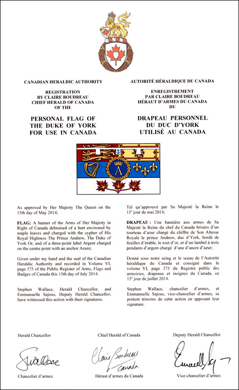 Additional InformationCreator(s)Original concept of Claire Boudreau, Chief Herald of Canada, assisted by the heralds of the Canadian Heraldic Authority. PainterDavid Farrar CalligrapherNot available Recipient TypeRoyal Family Other InformationThe personal flag of The Duke of York for use in Canada was approved by Her Majesty The Queen on the 15th day of May 2014. |
