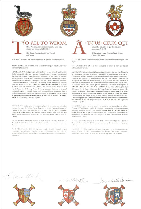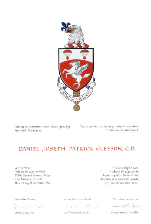 Arms of Daniel Joseph Patrick GleesonBlazonGules a pegasus forcene, on a chief enarched Argent two maple leaves each pendent from a parachute Gules; SymbolismThe colour red refers to the maroon beret of the airborne military forces, marking Major Gleeson’s continuing association with the Airborne Regiment Association. Further references to his service as a parachutist are the parachutes in the chief and the arching division line. Pegasus is a symbol of airborne forces, and it also represents fame, eloquence, and contemplation. |