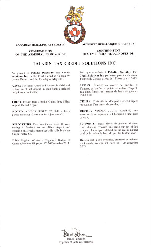 Additional InformationCreator(s)Original concept of Forrest Pass, assisted by the heralds of the Canadian Heraldic Authority. PainterDavid Farrar CalligrapherShirley Mangione Recipient TypeCivil Institution Other InformationThe recipient's emblems were originally recorded in the name of Paladin Disability Tax Credit Solutions in the Public Register of Arms, Flags and Badges of Canada, Volume VI, page 230, 15 May 2013. |