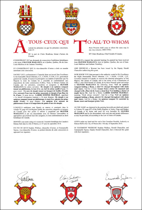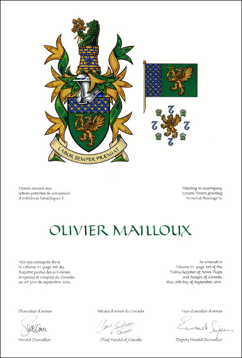 CrestBlazonIssuant from a tower Or masoned and charged with a fleur-de-lis Azure a demi-bear Vert holding a cluster of maple leaves Or; SymbolismDr. Mailloux identifies with the bear because it is a strong animal with foresight, wisdom and ferocity when defending its own. The tower evokes the coat of arms of Poitou, the ancestral land of the Mailloux family, which includes five gold castles. It also represents the ramparts surrounding the City of Québec, his hometown. The maple leaves and the fleurs-de-lis respectively symbolize his attachment to Canada and to his home province, Quebec, as well as to his family’s ancestral home, France. |