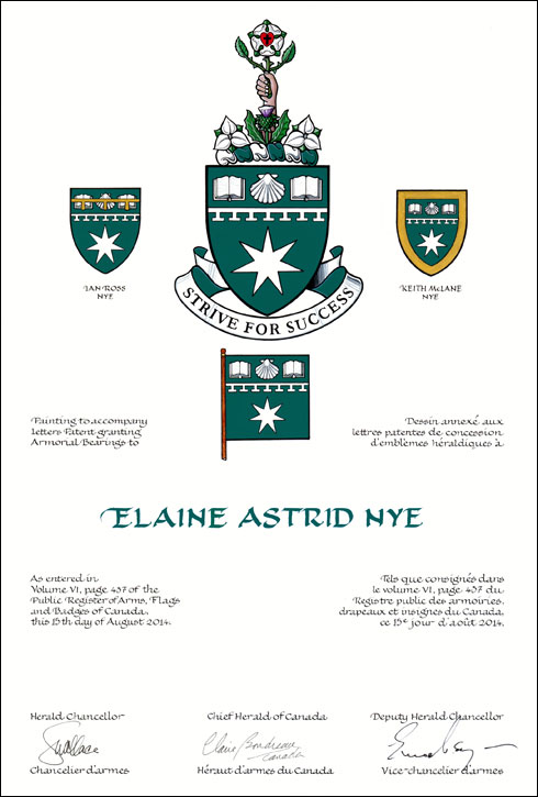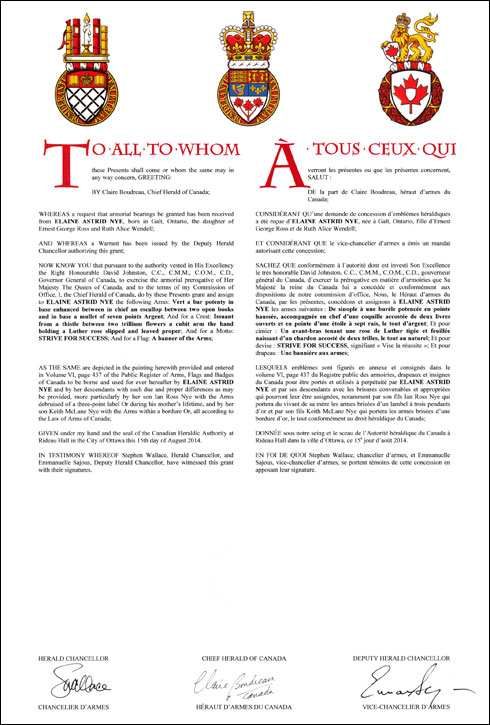 CrestBlazonIssuant from a thistle between two trillium flowers a cubit arm the hand holding a Luther rose slipped and leaved proper; SymbolismThe Luther Rose alludes to the Lutheran heritage of the family of Mrs. Nye’s mother. The hand grasping upwards is inspired by the crest of the Chief of Clan Ross, Mrs. Nye’s maiden surname being Ross. The two trillium flowers represent her sons, and Ontario, their birthplace. |