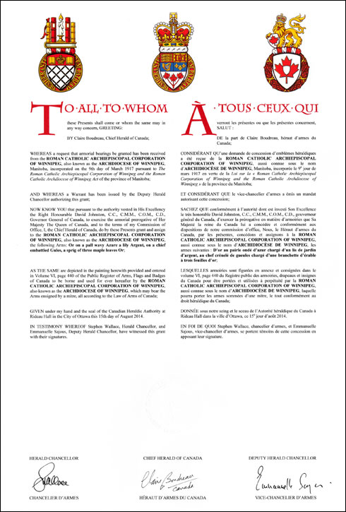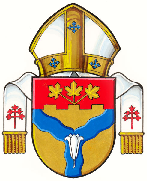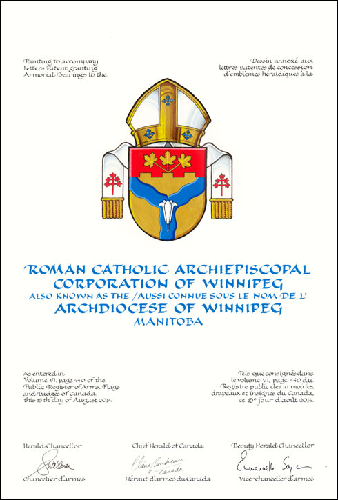 Arms of the Roman Catholic Archiepiscopal Corporation of Winnipeg (also known as the Archdiocese of Winnipeg)BlazonOr on a pall wavy Azure a lily Argent, on a chief embattled Gules, a sprig of three maple leaves Or; SymbolismThe Y-shape alludes to the Forks (a traditional meeting place for First Nations Peoples), where the Red and Assiniboine rivers converge at Winnipeg to form a single stream. The gold of the shield represents the wheat fields of southern Manitoba and, by extension, the Eucharist as the bread of life. The blue refers to the waters of baptism, the gateway to Christian life. The lily refers to the Blessed Virgin Mary, patronness of the cathedral of the Archdiocese, and to St. Joseph, the principal patron of the Archdiocese, the city of Winnipeg and Canada. The crenellated line refers to Fort Rouge, the settlement established on the site of Winnipeg in 1738 by the explorer La Vérendrye. The maple leaves are a Canadian symbol and allude to the diversity of the archdiocese’s population, and their number represents the Holy Trinity |
