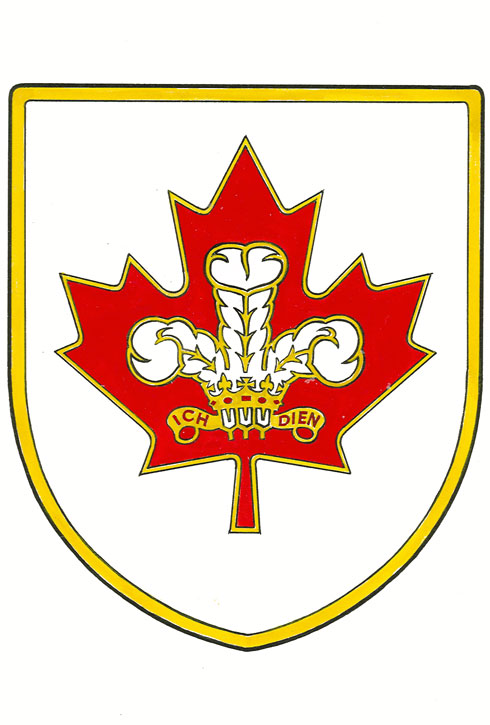 Badge of Prince Charles, Prince of WalesBlazonOn an escutcheon Argent a maple leaf Gules charged with the Badge of the Heir Apparent its feathers Argent its coronet Or jewelled Gules its scroll Or inscribed ICH DIEN Gules; SymbolismThis badge was designed to be worn as a pin by security and logistics personnel during a Canadian tour undertaken by members of the Royal Family. It uses the personal cypher (usually the initial letter of the name ensigned by the appropriate heraldic crown or coronet) or badge of the member of the Royal Family undertaking the tour, along with a particular background shape and combination of colours. |