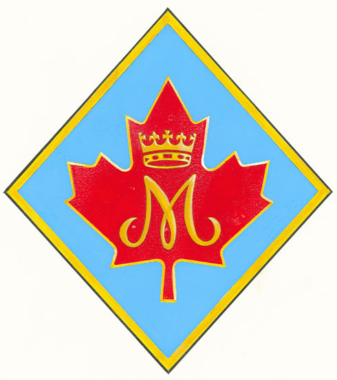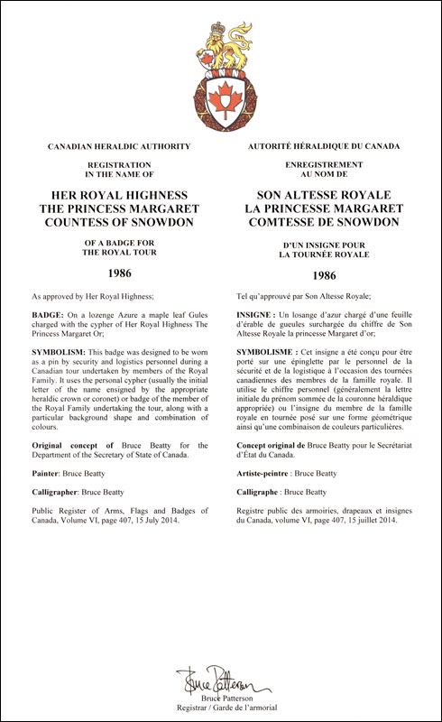 Badge of Princess Margaret, Countess of SnowdonBlazonOn a lozenge Azure a maple leaf Gules charged with the cypher of Her Royal Highness The Princess Margaret Or; SymbolismThis badge was designed to be worn as a pin by security and logistics personnel during a Canadian tour undertaken by members of the Royal Family. It uses the personal cypher (usually the initial letter of the name ensigned by the appropriate heraldic crown or coronet) or badge of the member of the Royal Family undertaking the tour, along with a particular background shape and combination of colours. |