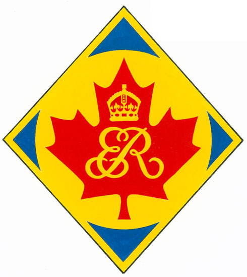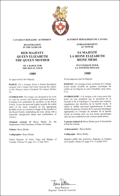 Badge of Queen Elizabeth, The Queen MotherBlazonOn a lozenge Azure a bezant throughout charged with a maple leaf Gules bearing the cypher of Her Majesty Queen Elizabeth The Queen Mother Or; SymbolismThis badge was designed to be worn as a pin by security and logistics personnel during a Canadian tour undertaken by members of the Royal Family. It uses the personal cypher (usually the initial letter of the name ensigned by the appropriate heraldic crown or coronet) or badge of the member of the Royal Family undertaking the tour, along with a particular background shape and combination of colours. |