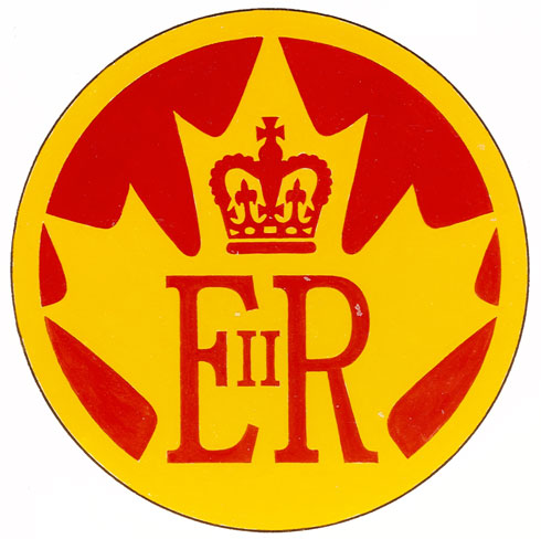 Badge of Queen Elizabeth IIBlazonOn a torteau a maple leaf throughout Or charged with the cypher of Her Majesty Queen Elizabeth II Gules; SymbolismThis badge was designed to be worn as a pin by security and logistics personnel during a Canadian tour undertaken by members of the Royal Family. It uses the personal cypher (usually the initial letter of the name ensigned by the appropriate heraldic crown or coronet) or badge of the member of the Royal Family undertaking the tour, along with a particular background shape and combination of colours. |
