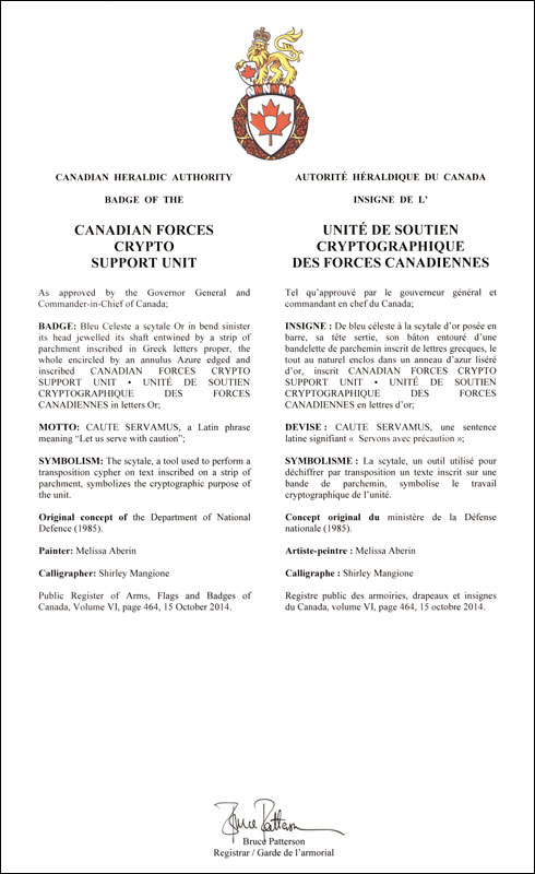 Badge of the Canadian Forces Crypto Support UnitBlazonBleu Celeste a scytale Or in bend sinister its head jewelled its shaft entwined by a strip of parchment inscribed in Greek letters proper, the whole encircled by an annulus Azure edged and inscribed CANADIAN FORCES CRYPTO SUPPORT UNIT • UNITÉ DE SOUTIEN CRYPTOGRAPHIQUE DES FORCES CANADIENNES in letters Or; SymbolismThe scytale, a tool used to perform a transposition cypher on text inscribed on a strip of parchment, symbolizes the cryptographic purpose of the unit. |