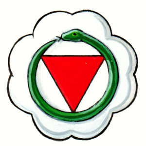 Badge of Dianne Louise AtkinsonBlazonOn a poppy Argent a triangle inverted Gules encircled by a serpent Vert; SymbolismThe red triangle repeats the symbolism of mother and woman. The snake and the triangle resting upon a white poppy complete the three basic geometric shapes: circle, triangle and square. The snake is symbolic of knowledge, cunning and change, as expressed in Celtic mythology. Its green colour is a reference to the colour of Ms. Atkinson’s eyes. |