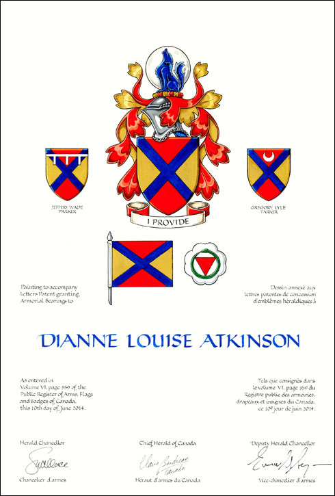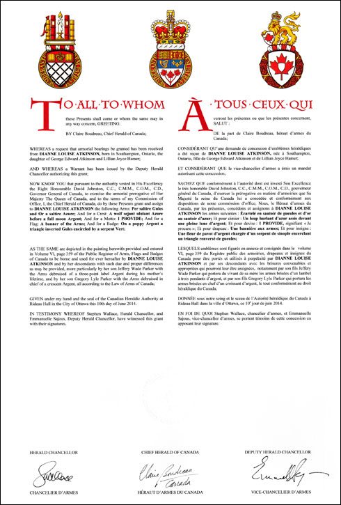 Additional InformationCreator(s)Original concept of Dianne Louise Atkinson, assisted by the heralds of the Canadian Heraldic Authority. PainterMelissa Aberin CalligrapherShirley Mangione Recipient TypeIndividual |