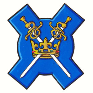 Badge of Patrick Hubert RyanBlazonA saltire nowy Azure charged with two swords in saltire Argent hilted Or points in base enfiling an ancient crown Or jewelled proper; SymbolismThe coronet represents Mr. Ryan’s and his ancestors’ service to their sovereigns. The swords are another reference to Mr. Ryan’s military career, and the X shape alludes to the cross of St. Andrew and thus his Scottish and Nova Scotian heritage. |
