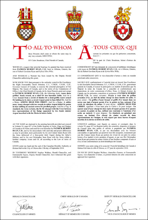 Additional InformationCreator(s)Original concept of Patrick Ryan and Mark Elson, assisted by the heralds of the Canadian Heraldic Authority. PainterRobert Grey CalligrapherShirley Mangione Recipient TypeIndividual |