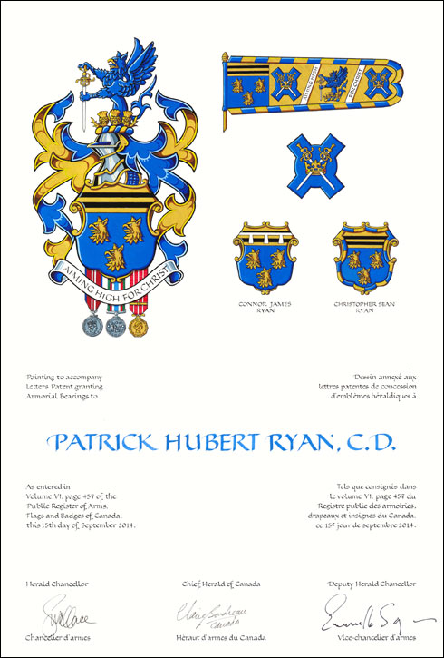 Arms of Patrick Hubert RyanBlazonAzure three griffins’ heads erased, on a chief Or two barrulets Sable; SymbolismThe blue field symbolizes Nova Scotia, Mr. Ryan’s home. The griffin heads, found in other Ryan arms of Ireland, allude to his Irish ancestry. Black and yellow are the colours of the Duchy of Württemberg, in present-day Germany, from where another branch of his family emigrated to Nova Scotia. The pattern of horizontal stripes is inspired by the arms of Isenburg, the family’s ancestral town in Württemberg. |