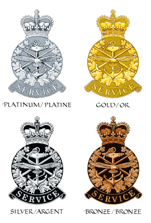 Canadian Forces Service BadgeBlazonOn a roundel a wreath of maple leaves overall a fouled anchor surmounted by two crusader’s swords in saltire and an eagle volant affronty head to the sinister, all ensigned by the Royal Crown and resting on scroll inscribed SERVICE; SymbolismThe design is based on the badge of the Canadian Armed Forces. The anchor, the swords and the eagle represent the sea, land and air environments of the Forces. The word “SERVICE” and the colours, platinum (from 42 years on), gold (32 to 41 years), silver (22 to 31 years) and bronze (from completion of training to 21 years), indicate honourable service as a member of the Forces. The maple leaves represent service to Canada, and the Crown, to the Sovereign. |